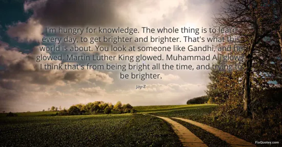 Jay-Z. "I'm hungry for knowledge. The whole thing is to learn every day, to get brighter and brighter. That's what this world is about. You look at someone like Gandhi, and he glowed. Martin Luther King glowed. Muhammad Ali glows. I think that's from being bright all the time, and trying to be brighter." FixQuotes. January 15, 2026. https://fixquotes.com/quotes/im-hungry-for-knowledge-the-whole-thing-is-to-80267/.