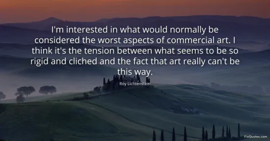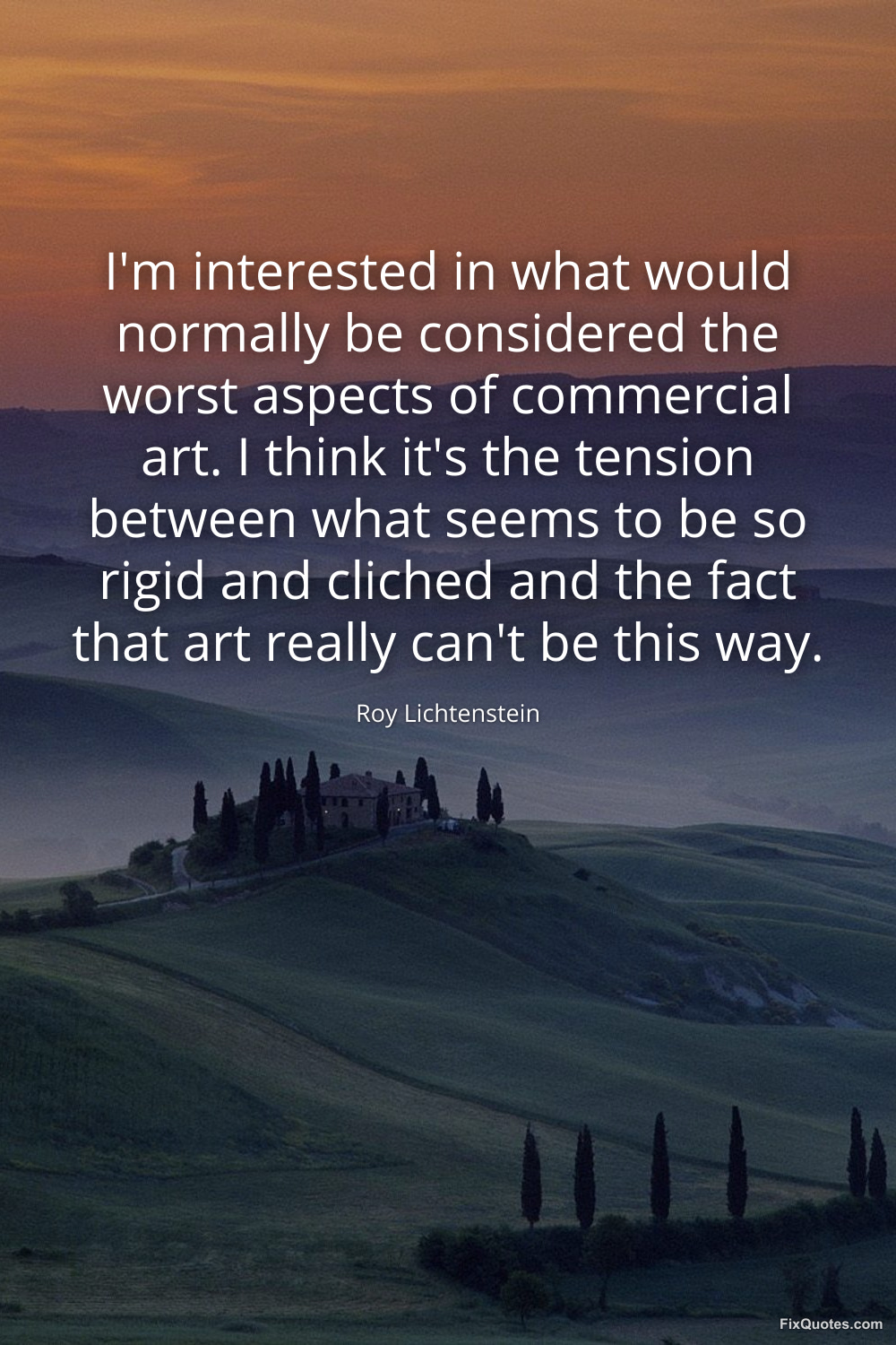 Lichtenstein, Roy. (2026, January 16). I'm interested in what would normally be considered the worst aspects of commercial art. I think it's the tension between what seems to be so rigid and cliched and the fact that art really can't be this way. FixQuotes. https://fixquotes.com/quotes/im-interested-in-what-would-normally-be-134642/