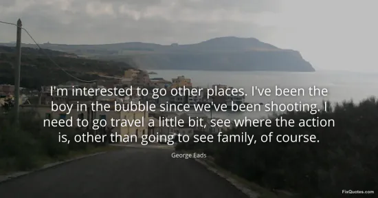 Eads, George. (2026, February 18). I'm interested to go other places. I've been the boy in the bubble since we've been shooting. I need to go travel a little bit, see where the action is, other than going to see family, of course. FixQuotes. https://fixquotes.com/quotes/im-interested-to-go-other-places-ive-been-the-boy-60056/