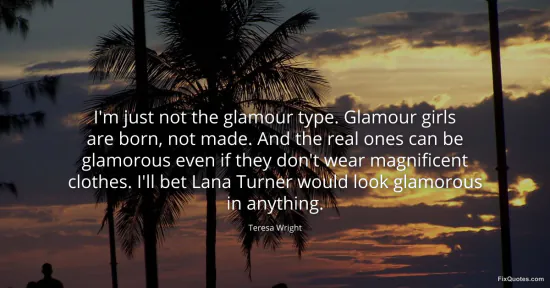 Wright, Teresa. "I'm just not the glamour type. Glamour girls are born, not made. And the real ones can be glamorous even if they don't wear magnificent clothes. I'll bet Lana Turner would look glamorous in anything." FixQuotes. January 16, 2026. https://fixquotes.com/quotes/im-just-not-the-glamour-type-glamour-girls-are-113502/.