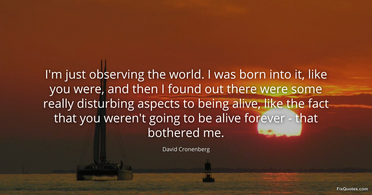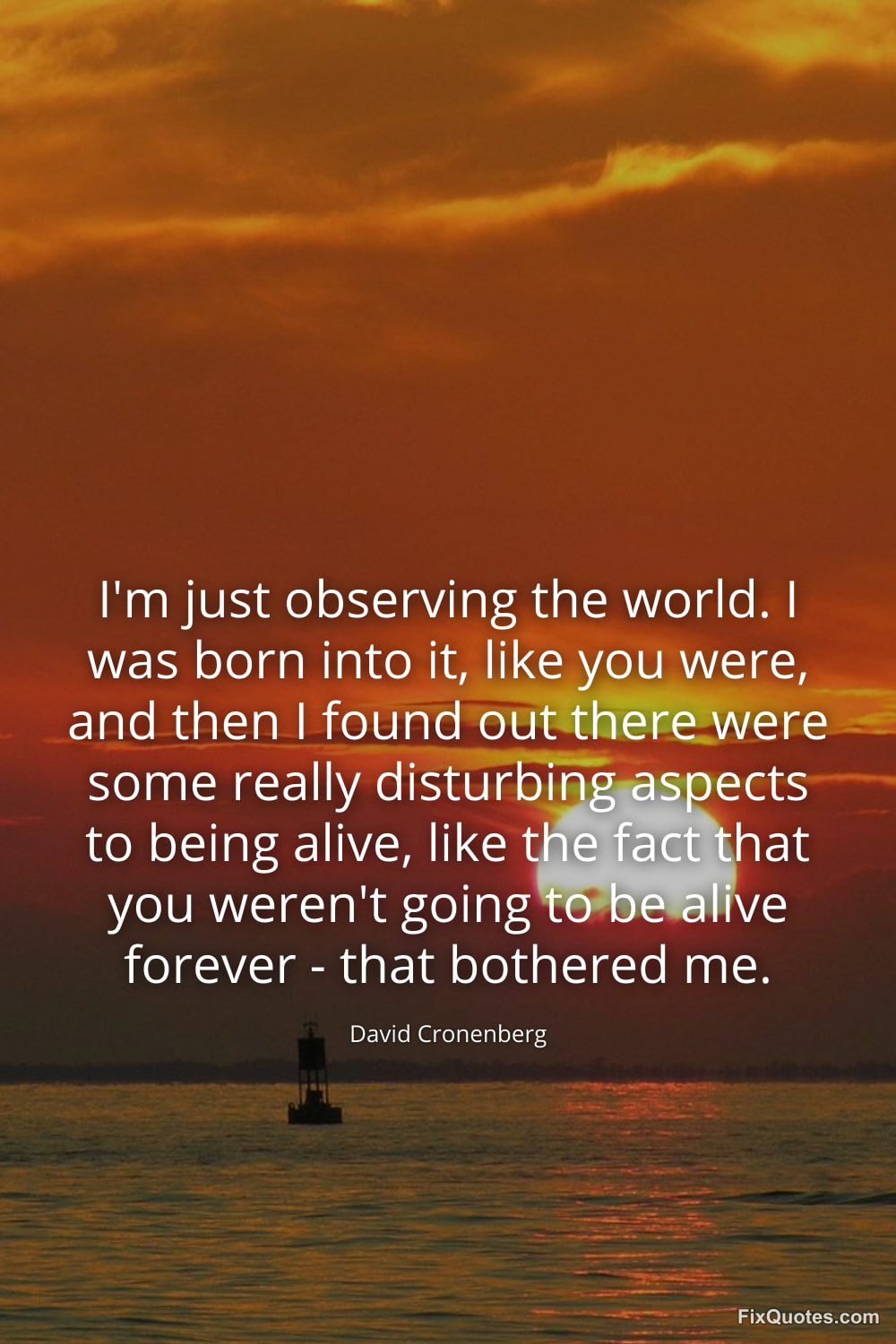 Cronenberg, David. (2026, January 15). I'm just observing the world. I was born into it, like you were, and then I found out there were some really disturbing aspects to being alive, like the fact that you weren't going to be alive forever - that bothered me. FixQuotes. https://fixquotes.com/quotes/im-just-observing-the-world-i-was-born-into-it-143474/