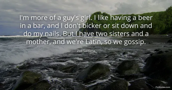 Saldana, Zoe. "I'm more of a guy's girl. I like having a beer in a bar, and I don't bicker or sit down and do my nails. But I have two sisters and a mother, and we're Latin, so we gossip." FixQuotes. January 16, 2026. https://fixquotes.com/quotes/im-more-of-a-guys-girl-i-like-having-a-beer-in-a-135355/.