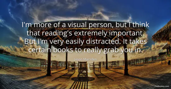 Marsden, Jason. "I'm more of a visual person, but I think that reading's extremely important. But I'm very easily distracted. It takes certain books to really grab you in." FixQuotes. January 16, 2026. https://fixquotes.com/quotes/im-more-of-a-visual-person-but-i-think-that-106248/.