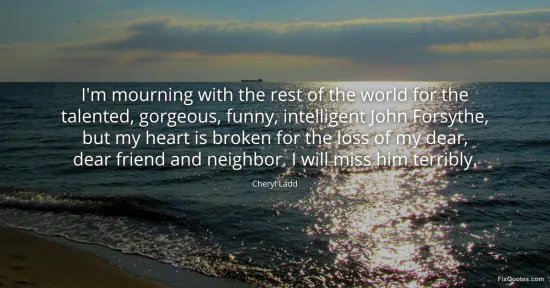 Ladd, Cheryl. (2026, February 19). I'm mourning with the rest of the world for the talented, gorgeous, funny, intelligent John Forsythe, but my heart is broken for the loss of my dear, dear friend and neighbor. I will miss him terribly. FixQuotes. https://fixquotes.com/quotes/im-mourning-with-the-rest-of-the-world-for-the-41119/