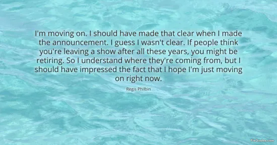 Philbin, Regis. "I'm moving on. I should have made that clear when I made the announcement. I guess I wasn't clear. If people think you're leaving a show after all these years, you might be retiring. So I understand where they're coming from, but I should have impressed the fact that I hope I'm just moving on right now." FixQuotes. January 16, 2026. https://fixquotes.com/quotes/im-moving-on-i-should-have-made-that-clear-when-i-101828/.