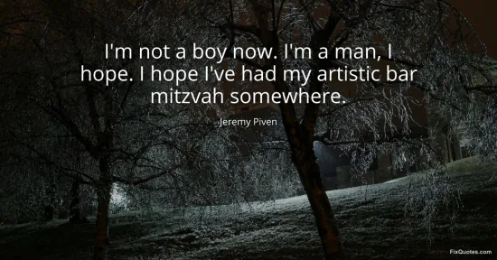 Piven, Jeremy. (2026, January 17). I'm not a boy now. I'm a man, I hope. I hope I've had my artistic bar mitzvah somewhere. FixQuotes. https://fixquotes.com/quotes/im-not-a-boy-now-im-a-man-i-hope-i-hope-ive-had-57185/