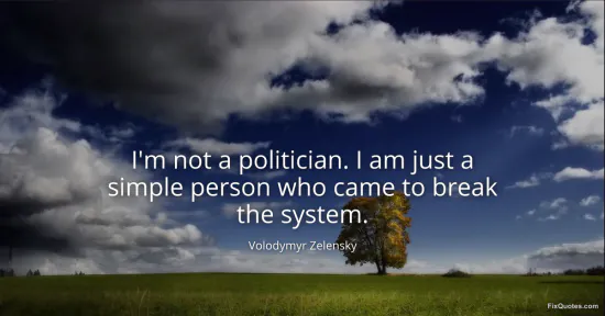Zelensky, Volodymyr. "I'm not a politician. I am just a simple person who came to break the system." FixQuotes. February 19, 2026. https://fixquotes.com/quotes/im-not-a-politician-i-am-just-a-simple-person-who-172138/.