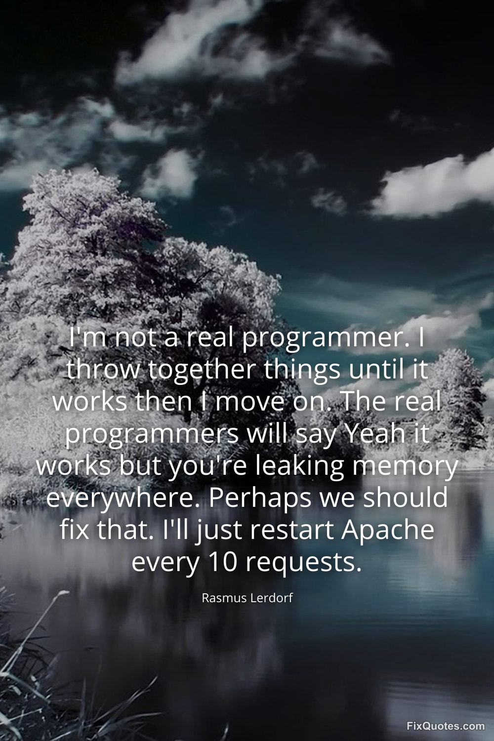 Lerdorf, Rasmus. (2026, February 10). I'm not a real programmer. I throw together things until it works then I move on. The real programmers will say Yeah it works but you're leaking memory everywhere. Perhaps we should fix that. I'll just restart Apache every 10 requests. FixQuotes. https://fixquotes.com/quotes/im-not-a-real-programmer-i-throw-together-things-185041/