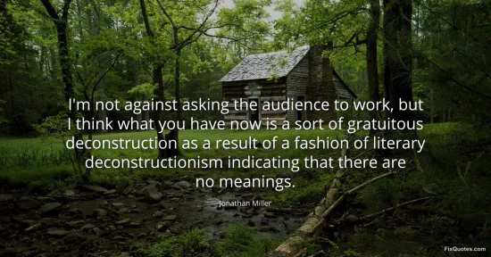 Miller, Jonathan. "I'm not against asking the audience to work, but I think what you have now is a sort of gratuitous deconstruction as a result of a fashion of literary deconstructionism indicating that there are no meanings." FixQuotes. January 16, 2026. https://fixquotes.com/quotes/im-not-against-asking-the-audience-to-work-but-i-103673/.