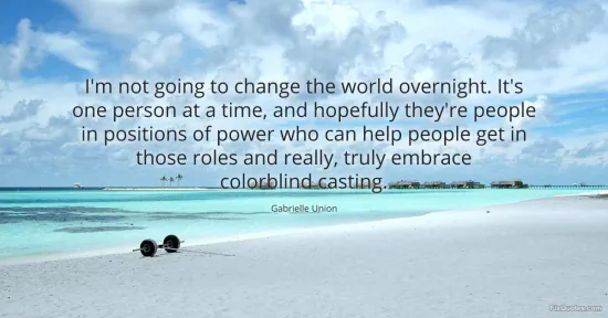 Union, Gabrielle. "I'm not going to change the world overnight. It's one person at a time, and hopefully they're people in positions of power who can help people get in those roles and really, truly embrace colorblind casting." FixQuotes. January 17, 2026. https://fixquotes.com/quotes/im-not-going-to-change-the-world-overnight-its-51691/.
