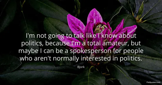 Bjork. "I'm not going to talk like I know about politics, because I'm a total amateur, but maybe I can be a spokesperson for people who aren't normally interested in politics." FixQuotes. January 15, 2026. https://fixquotes.com/quotes/im-not-going-to-talk-like-i-know-about-politics-140556/.