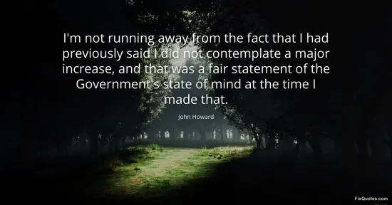 Howard, John. "I'm not running away from the fact that I had previously said I did not contemplate a major increase, and that was a fair statement of the Government's state of mind at the time I made that." FixQuotes. January 15, 2026. https://fixquotes.com/quotes/im-not-running-away-from-the-fact-that-i-had-155035/.