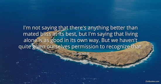 "I'm not saying that there's anything better than mated bliss at its best, but I'm saying that living alone is as good in its own way. But we haven't quite given ourselves permission to recognize that." FixQuotes, 16 Jan. 2026, https://fixquotes.com/quotes/im-not-saying-that-theres-anything-better-than-98066/. Accessed 12 Feb. 2026.