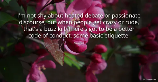 Def, Mos. "I'm not shy about heated debate or passionate discourse, but when people get crazy or rude, that's a buzz kill. There's got to be a better code of conduct, some basic etiquette." FixQuotes. January 16, 2026. https://fixquotes.com/quotes/im-not-shy-about-heated-debate-or-passionate-89370/.