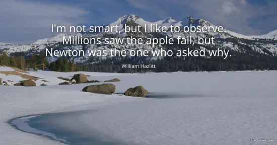 Hazlitt, William. "I'm not smart, but I like to observe. Millions saw the apple fall, but Newton was the one who asked why." FixQuotes. January 15, 2026. https://fixquotes.com/quotes/im-not-smart-but-i-like-to-observe-millions-saw-151650/.