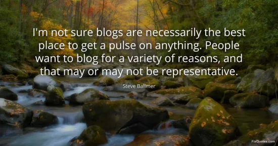 Ballmer, Steve. "I'm not sure blogs are necessarily the best place to get a pulse on anything. People want to blog for a variety of reasons, and that may or may not be representative." FixQuotes. January 16, 2026. https://fixquotes.com/quotes/im-not-sure-blogs-are-necessarily-the-best-place-106877/.