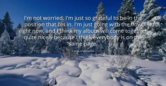 Underwood, Carrie. "I'm not worried. I'm just so grateful to be in the position that I'm in. I'm just going with the flow right now, and I think my album will come together quite nicely because I think everybody is on the same page." FixQuotes. January 16, 2026. https://fixquotes.com/quotes/im-not-worried-im-just-so-grateful-to-be-in-the-109939/.