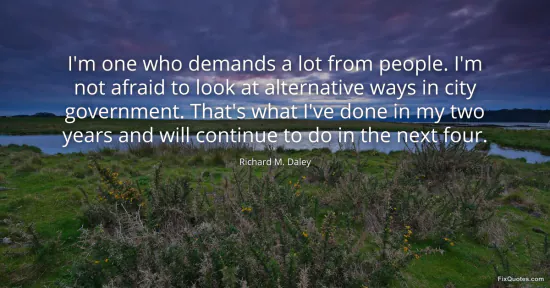 Daley, Richard M. "I'm one who demands a lot from people. I'm not afraid to look at alternative ways in city government. That's what I've done in my two years and will continue to do in the next four." FixQuotes. January 17, 2026. https://fixquotes.com/quotes/im-one-who-demands-a-lot-from-people-im-not-71042/.