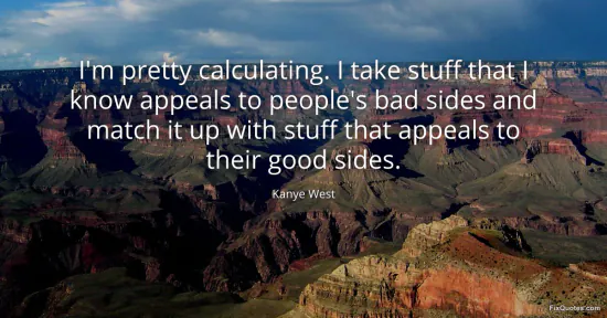 West, Kanye. (2026, January 15). I'm pretty calculating. I take stuff that I know appeals to people's bad sides and match it up with stuff that appeals to their good sides. FixQuotes. https://fixquotes.com/quotes/im-pretty-calculating-i-take-stuff-that-i-know-156464/