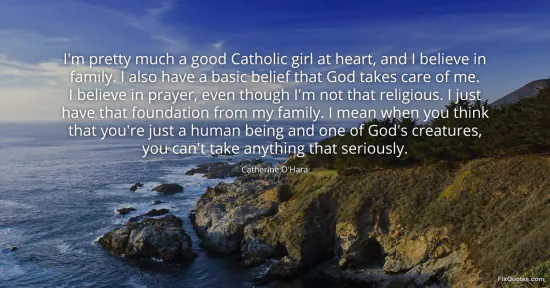 O'Hara, Catherine. "I'm pretty much a good Catholic girl at heart, and I believe in family. I also have a basic belief that God takes care of me. I believe in prayer, even though I'm not that religious. I just have that foundation from my family. I mean when you think that you're just a human being and one of God's creatures, you can't take anything that seriously." FixQuotes. January 16, 2026. https://fixquotes.com/quotes/im-pretty-much-a-good-catholic-girl-at-heart-and-123342/.