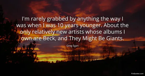 Egan, Greg. (2026, January 15). I'm rarely grabbed by anything the way I was when I was 10 years younger. About the only relatively new artists whose albums I own are Beck, and They Might Be Giants. FixQuotes. https://fixquotes.com/quotes/im-rarely-grabbed-by-anything-the-way-i-was-when-143914/