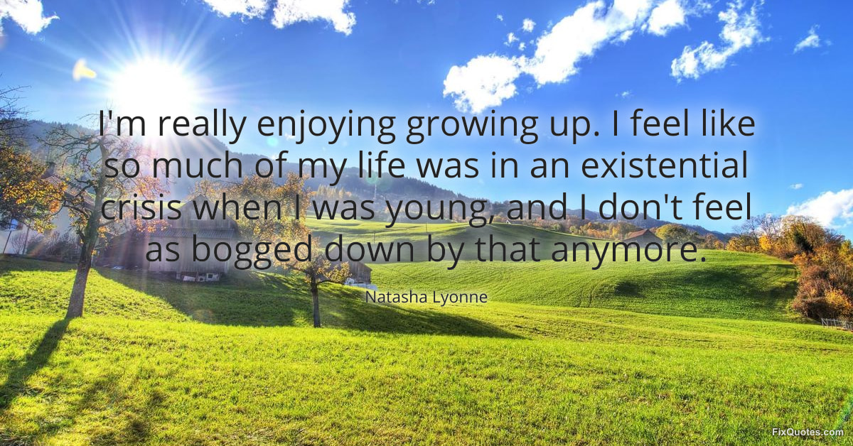 Lyonne, Natasha. (2026, January 25). I'm really enjoying growing up. I feel like so much of my life was in an existential crisis when I was young, and I don't feel as bogged down by that anymore. FixQuotes. https://fixquotes.com/quotes/im-really-enjoying-growing-up-i-feel-like-so-much-184352/