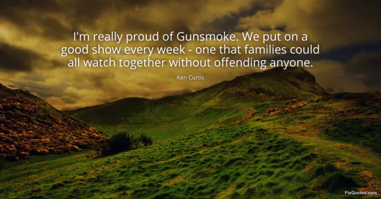 Curtis, Ken. "I'm really proud of Gunsmoke. We put on a good show every week - one that families could all watch together without offending anyone." FixQuotes. January 16, 2026. https://fixquotes.com/quotes/im-really-proud-of-gunsmoke-we-put-on-a-good-show-87930/.