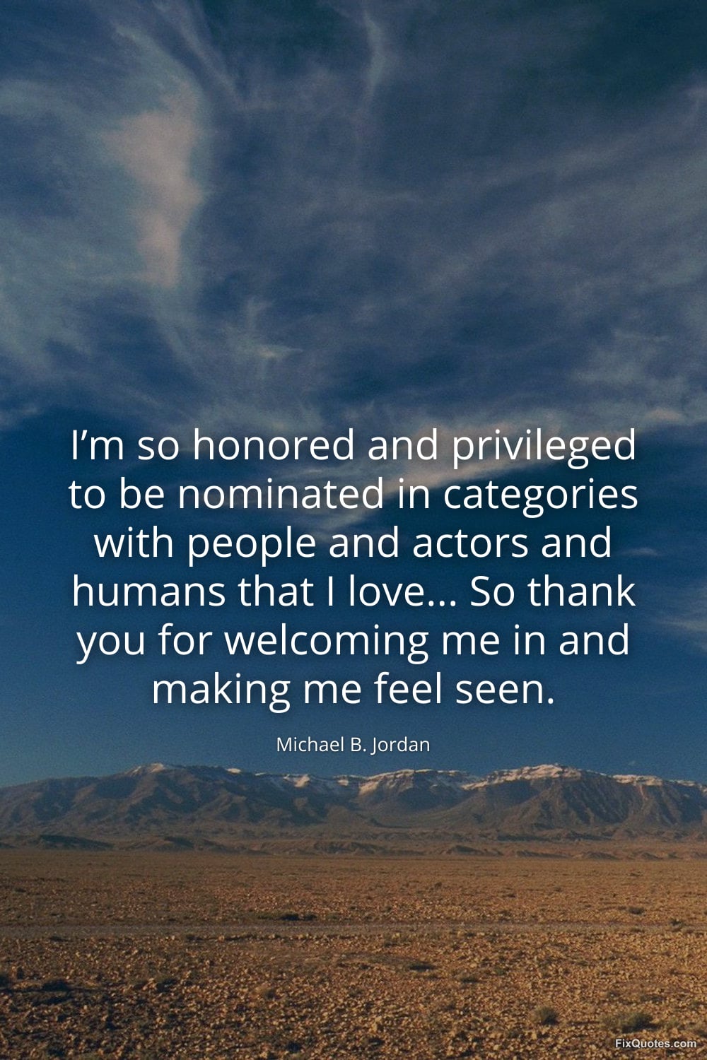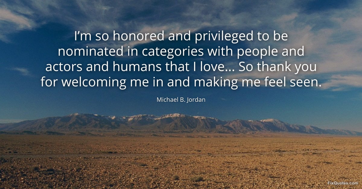 Jordan, Michael B. (2026, March 2). I’m so honored and privileged to be nominated in categories with people and actors and humans that I love... So thank you for welcoming me in and making me feel seen. FixQuotes. https://fixquotes.com/quotes/im-so-honored-and-privileged-to-be-nominated-in-185683/
