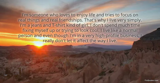 Diaz, Cameron. "I'm someone who loves to enjoy life and tries to focus on real things and real friendships. That's why I live very simply. I'm a jeans and T-shirt kind of girl. I don't spend much time fixing myself up or trying to look cool. I live like a normal person and even though I'm in a very high-profile business, I really don't let it affect the way I live." FixQuotes. January 15, 2026. https://fixquotes.com/quotes/im-someone-who-loves-to-enjoy-life-and-tries-to-139897/.