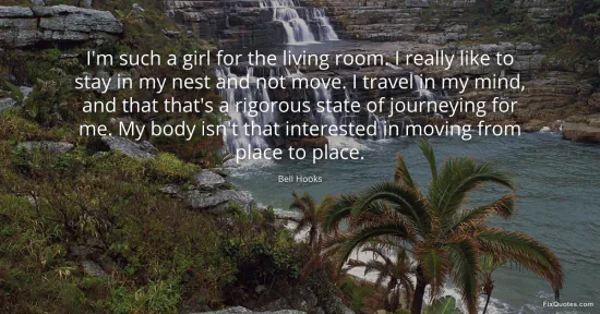 Hooks, Bell. (2026, January 15). I'm such a girl for the living room. I really like to stay in my nest and not move. I travel in my mind, and that that's a rigorous state of journeying for me. My body isn't that interested in moving from place to place. FixQuotes. https://fixquotes.com/quotes/im-such-a-girl-for-the-living-room-i-really-like-167028/