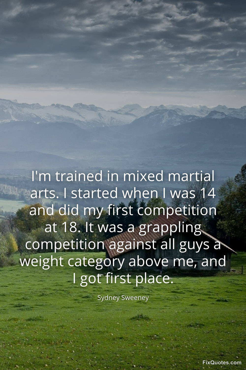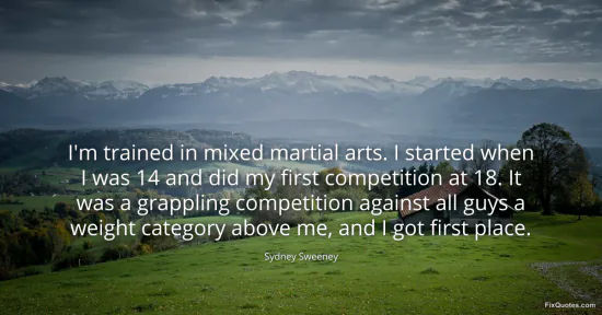Sweeney, Sydney. "I'm trained in mixed martial arts. I started when I was 14 and did my first competition at 18. It was a grappling competition against all guys a weight category above me, and I got first place." FixQuotes. January 11, 2026. https://fixquotes.com/quotes/im-trained-in-mixed-martial-arts-i-started-when-i-183752/.