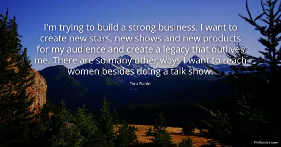 Banks, Tyra. (2026, January 16). I'm trying to build a strong business. I want to create new stars, new shows and new products for my audience and create a legacy that outlives me. There are so many other ways I want to reach women besides doing a talk show. FixQuotes. https://fixquotes.com/quotes/im-trying-to-build-a-strong-business-i-want-to-96209/