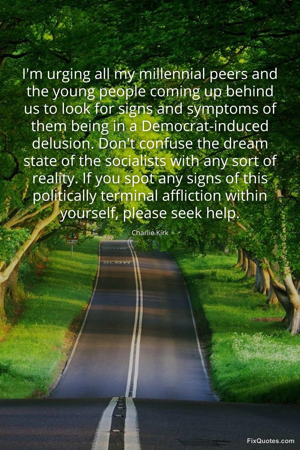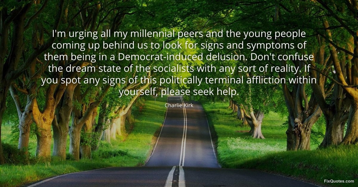 Kirk, Charlie. (2026, February 12). I'm urging all my millennial peers and the young people coming up behind us to look for signs and symptoms of them being in a Democrat-induced delusion. Don't confuse the dream state of the socialists with any sort of reality. If you spot any signs of this politically terminal affliction within yourself, please seek help. FixQuotes. https://fixquotes.com/quotes/im-urging-all-my-millennial-peers-and-the-young-173181/