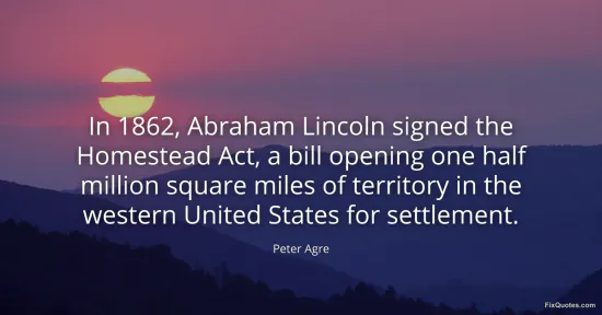 Agre, Peter. "In 1862, Abraham Lincoln signed the Homestead Act, a bill opening one half million square miles of territory in the western United States for settlement." FixQuotes. January 16, 2026. https://fixquotes.com/quotes/in-1862-abraham-lincoln-signed-the-homestead-act-131343/.