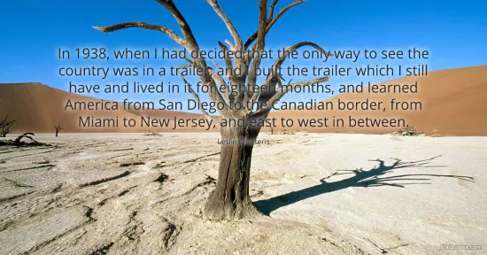 Charteris, Leslie. "In 1938, when I had decided that the only way to see the country was in a trailer, and I built the trailer which I still have and lived in it for eighteen months, and learned America from San Diego to the Canadian border, from Miami to New Jersey, and east to west in between." FixQuotes. January 15, 2026. https://fixquotes.com/quotes/in-1938-when-i-had-decided-that-the-only-way-to-150738/.