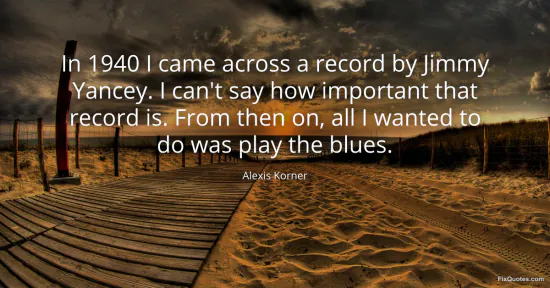 Korner, Alexis. "In 1940 I came across a record by Jimmy Yancey. I can't say how important that record is. From then on, all I wanted to do was play the blues." FixQuotes. January 16, 2026. https://fixquotes.com/quotes/in-1940-i-came-across-a-record-by-jimmy-yancey-i-121163/.