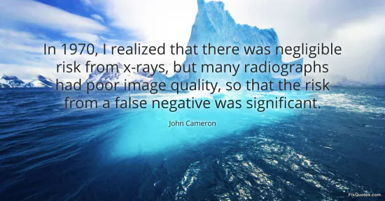 Cameron, John. "In 1970, I realized that there was negligible risk from x-rays, but many radiographs had poor image quality, so that the risk from a false negative was significant." FixQuotes. February 18, 2026. https://fixquotes.com/quotes/in-1970-i-realized-that-there-was-negligible-risk-64388/.