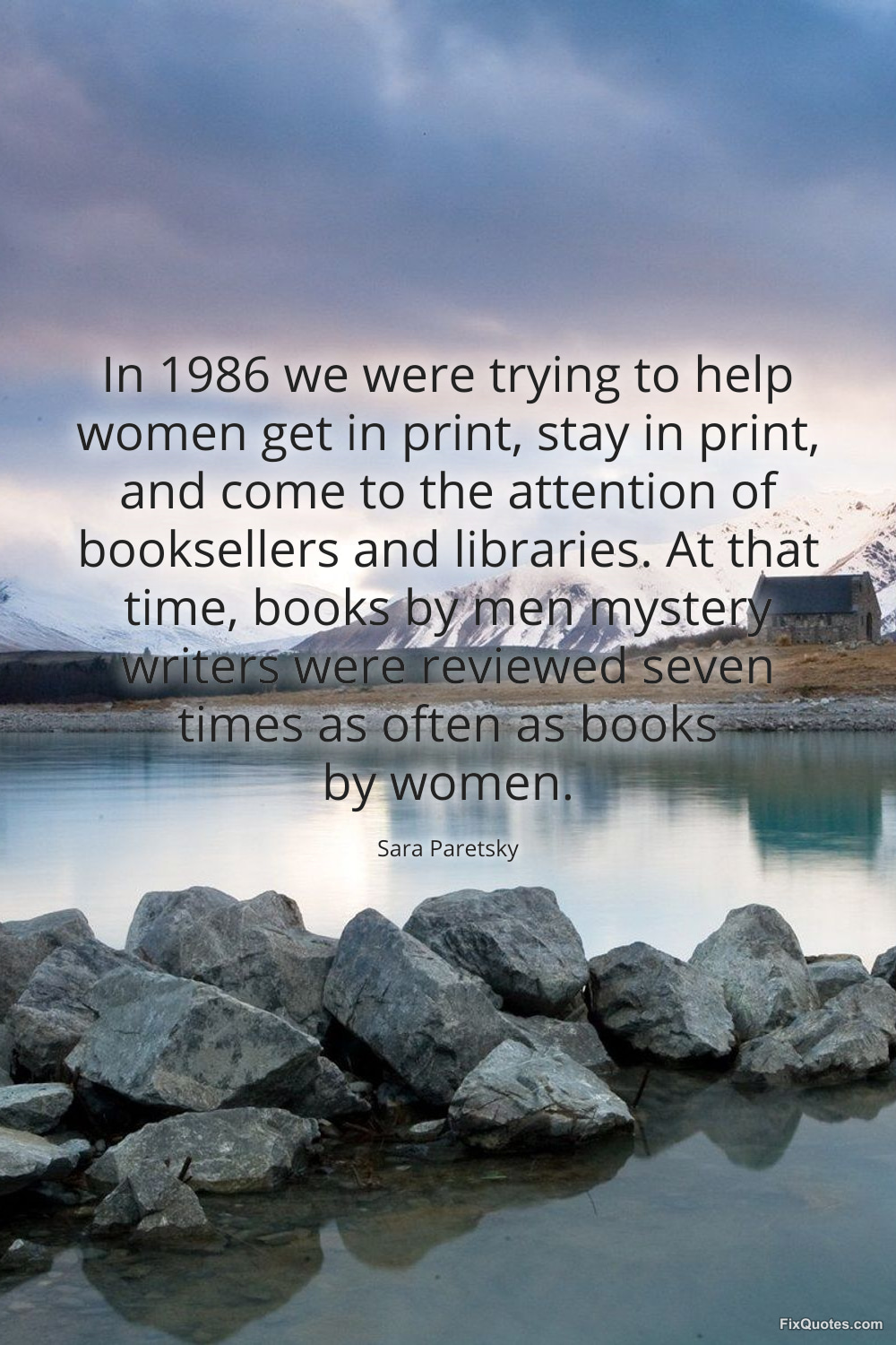Paretsky, Sara. (2026, January 16). In 1986 we were trying to help women get in print, stay in print, and come to the attention of booksellers and libraries. At that time, books by men mystery writers were reviewed seven times as often as books by women. FixQuotes. https://fixquotes.com/quotes/in-1986-we-were-trying-to-help-women-get-in-print-95076/