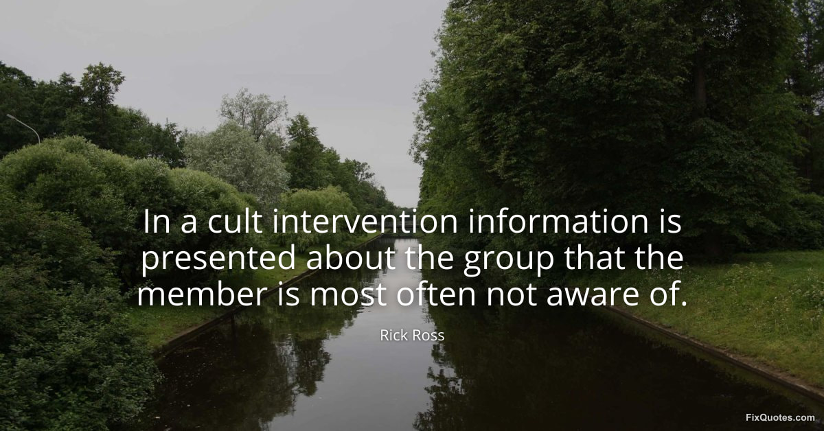 Ross, Rick. "In a cult intervention information is presented about the group that the member is most often not aware of." FixQuotes. January 16, 2026. https://fixquotes.com/quotes/in-a-cult-intervention-information-is-presented-91744/.