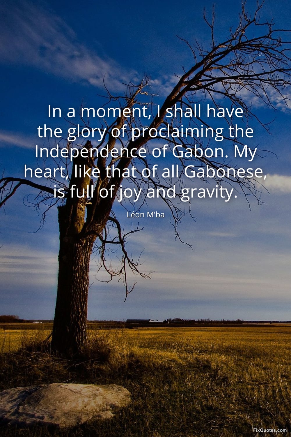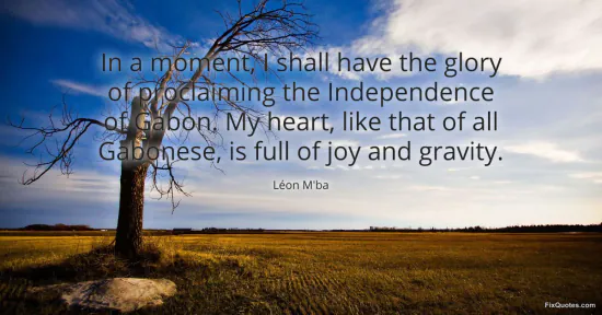 M'ba, Léon. "In a moment, I shall have the glory of proclaiming the Independence of Gabon. My heart, like that of all Gabonese, is full of joy and gravity." FixQuotes. March 16, 2026. https://fixquotes.com/quotes/in-a-moment-i-shall-have-the-glory-of-proclaiming-186116/.