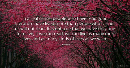 Hayakawa, S. I. (2026, January 16). In a real sense, people who have read good literature have lived more than people who cannot or will not read. It is not true that we have only one life to live; if we can read, we can live as many more lives and as many kinds of lives as we wish. FixQuotes. https://fixquotes.com/quotes/in-a-real-sense-people-who-have-read-good-118859/