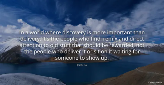 Ito, Joichi. (2026, January 17). In a world where discovery is more important than delivery, it's the people who find, remix and direct attention to old stuff that should be rewarded, not the people who deliver it or sit on it waiting for someone to show up. FixQuotes. https://fixquotes.com/quotes/in-a-world-where-discovery-is-more-important-than-70032/
