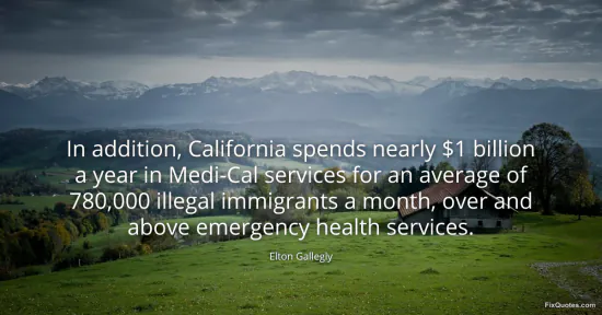 Gallegly, Elton. "In addition, California spends nearly $1 billion a year in Medi-Cal services for an average of 780,000 illegal immigrants a month, over and above emergency health services." FixQuotes. January 15, 2026. https://fixquotes.com/quotes/in-addition-california-spends-nearly-1-billion-a-82158/.