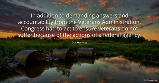 Hastings, Doc. "In addition to demanding answers and accountability from the Veterans Administration, Congress had to act to ensure veterans do not suffer because of the actions of a federal agency." FixQuotes. January 15, 2026. https://fixquotes.com/quotes/in-addition-to-demanding-answers-and-150465/.