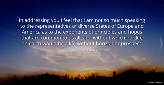Campbell-Bannerman, Henry. (2026, January 17). In addressing you I feel that I am not so much speaking to the representatives of diverse States of Europe and America as to the exponents of principles and hopes that are common to us all, and without which our life on earth would be a life without horizon or prospect. FixQuotes. https://fixquotes.com/quotes/in-addressing-you-i-feel-that-i-am-not-so-much-53756/