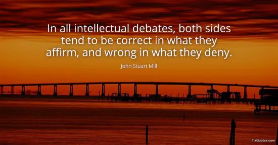 Mill, John Stuart. "In all intellectual debates, both sides tend to be correct in what they affirm, and wrong in what they deny." FixQuotes. January 15, 2026. https://fixquotes.com/quotes/in-all-intellectual-debates-both-sides-tend-to-be-32190/.