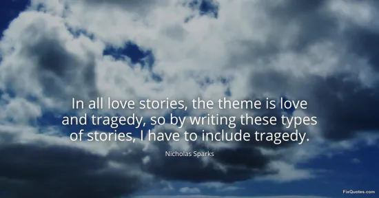 Sparks, Nicholas. (2026, February 17). In all love stories, the theme is love and tragedy, so by writing these types of stories, I have to include tragedy. FixQuotes. https://fixquotes.com/quotes/in-all-love-stories-the-theme-is-love-and-tragedy-103889/