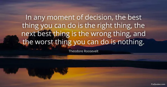 Roosevelt, Theodore. (2026, February 9). In any moment of decision, the best thing you can do is the right thing, the next best thing is the wrong thing, and the worst thing you can do is nothing. FixQuotes. https://fixquotes.com/quotes/in-any-moment-of-decision-the-best-thing-you-can-33446/