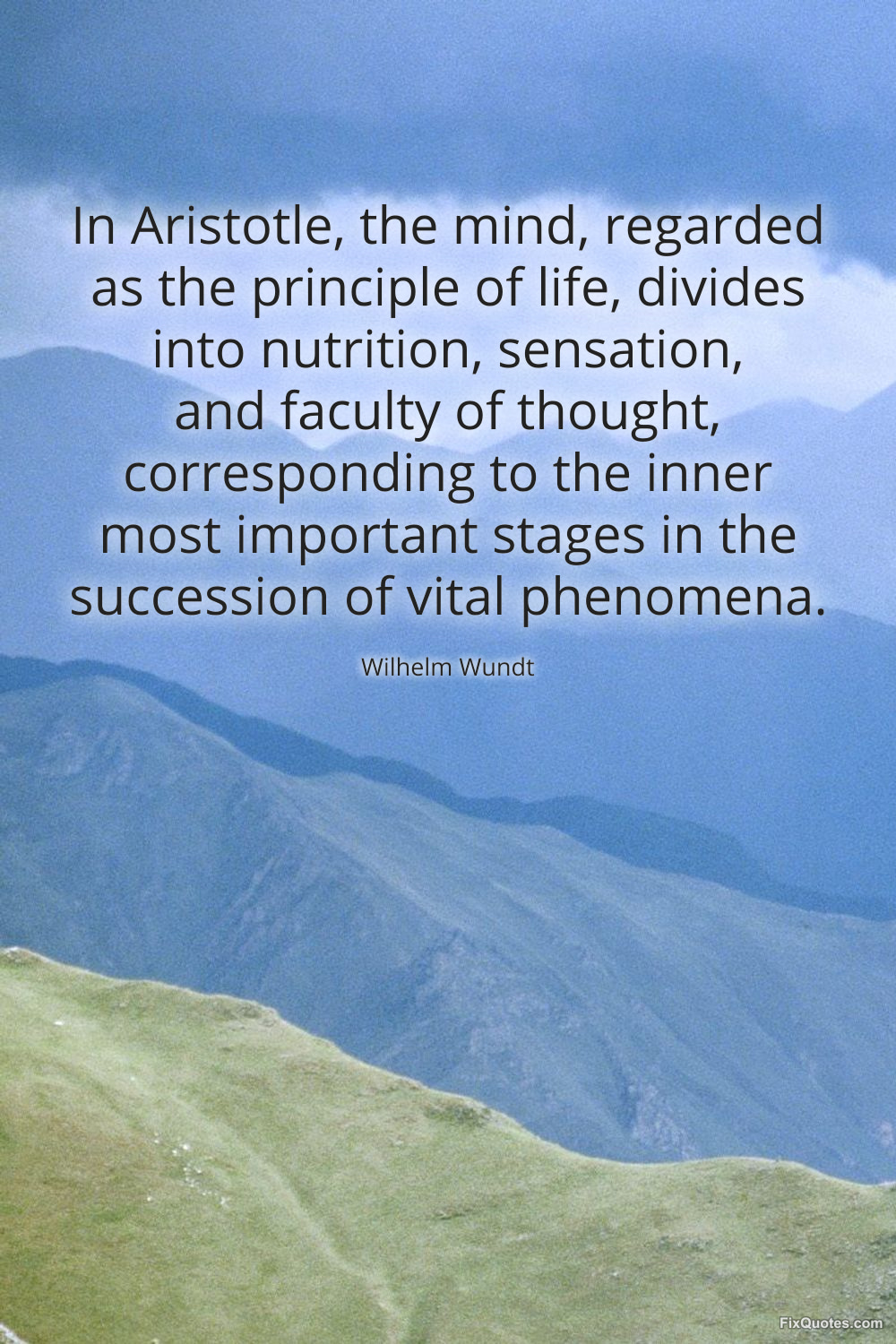 Wundt, Wilhelm. (2026, February 17). In Aristotle, the mind, regarded as the principle of life, divides into nutrition, sensation, and faculty of thought, corresponding to the inner most important stages in the succession of vital phenomena. FixQuotes. https://fixquotes.com/quotes/in-aristotle-the-mind-regarded-as-the-principle-145528/