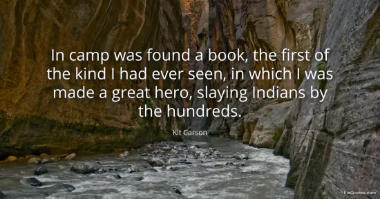Carson, Kit. "In camp was found a book, the first of the kind I had ever seen, in which I was made a great hero, slaying Indians by the hundreds." FixQuotes. January 18, 2026. https://fixquotes.com/quotes/in-camp-was-found-a-book-the-first-of-the-kind-i-21432/.